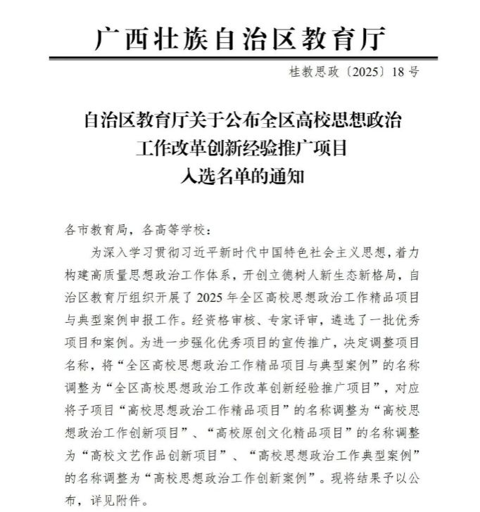 本次评选经资格审核、专家评审等多轮严格遴选,最终从全区高校申报项目中确定一批优秀项目予以推广。我校入选的项目以瑶族香哩歌这一独特民族文化载体为依托,将红色基因与非遗文化深度融合,既彰显了“感党恩、听党话、跟党走”的价值导向,又体现了民族文化赋能思政教育的鲜明特色,凭借扎实的实践成效和创新的育人思路脱颖而出。